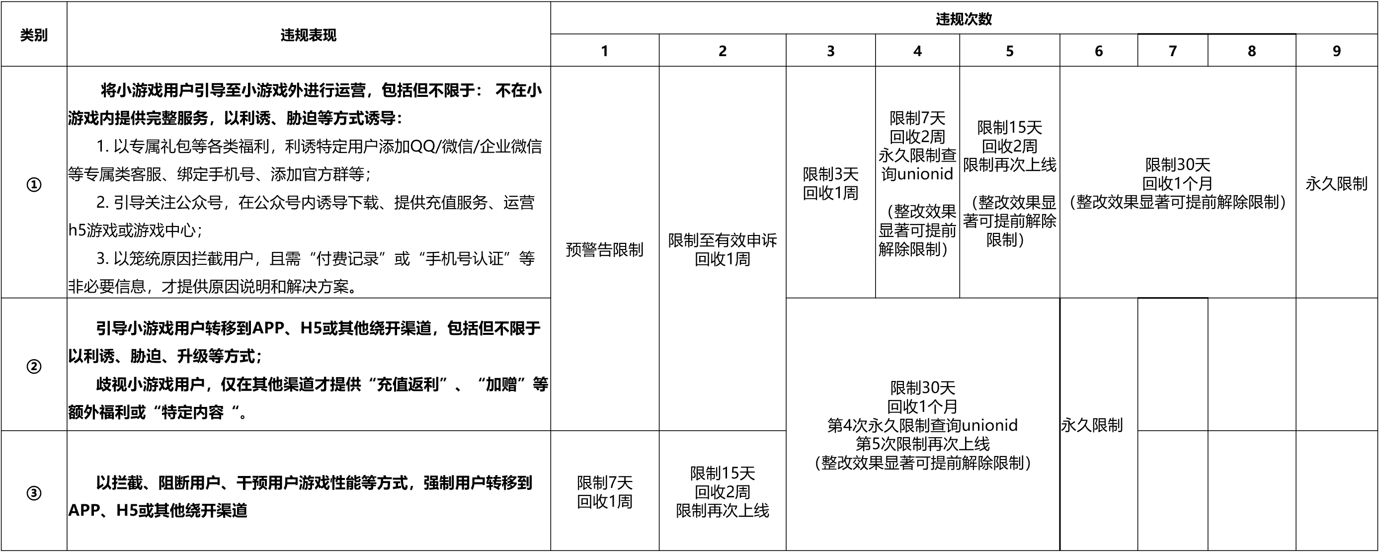 对于违反小游戏用户运营规范的情形,平台将视违规情节,进行相应处罚,并扣除主体信用分,详情见下表: