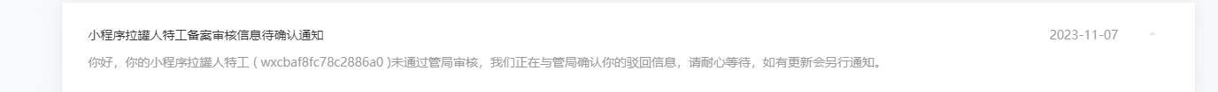 已经收到信息还有MP后台的信息,都显示管局打回了,但是点开小程序备案界面还是显示管局审核中,辛苦大佬帮忙解决一下!
