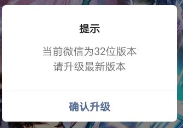 请问下打开游戏后提示这个,是因为32位版本的微信没法运行小游戏,还是因为小游戏本身没对32位微信做兼容导致的?有什么解决办法吗?