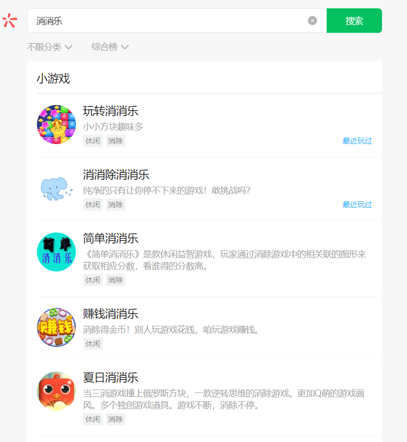但列表里的游戏都不是很知名的。在小程序搜索框中搜索消消乐,海滨消消乐以较高活跃排名第一。但没有出现在综合搜索框的小游戏结果中,请问这是什么原因?需要达到什么要求才能进入这个列表?