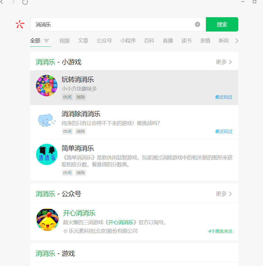 在微信综合搜索框输入“消消乐”出现了几个小游戏结果的列表,