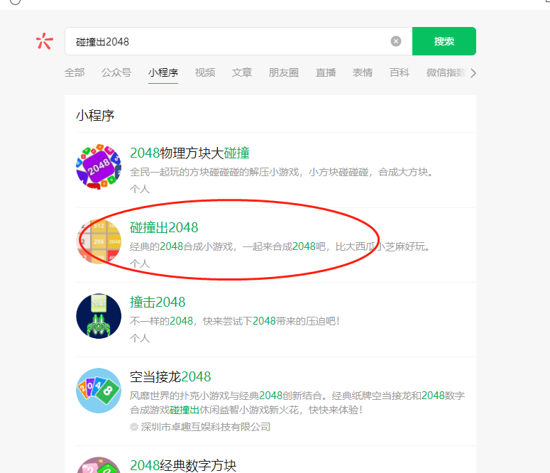 只能搜全称的时候才能搜出来,名称是:碰撞出2048。我只搜2048的时候,就搜不到我的小游戏,而且我微信开放平台认证了,绑定我的好几个小游戏后,唯独这个小游戏是看不到的