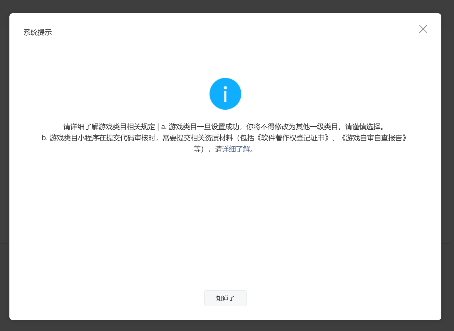 大佬们好,我是新手一枚,现开发了一款小游戏想要上传微信小程序,已经注册了个人的开发者账号,在服务类目里选择小游戏的时候提醒我如果上传游戏需要资质,想了解下个人开发者上传小游戏都需要哪些资质,求解答!!!
