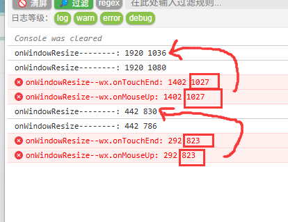 4.然后打开VSconsole,观看打印,可以发现onWindowResize方法每次点击最大化或最小化的时候被触发两次,仅第二次的尺寸是正常值,但是鼠标点击事件返回的坐标位置,却是基于不正常的那个尺寸返回。最大化后,窗体高1080,但鼠标返回坐标离1080差距较大。当退出最大化后,窗体只有786的高度,但是返回坐标却是823,明显超过。