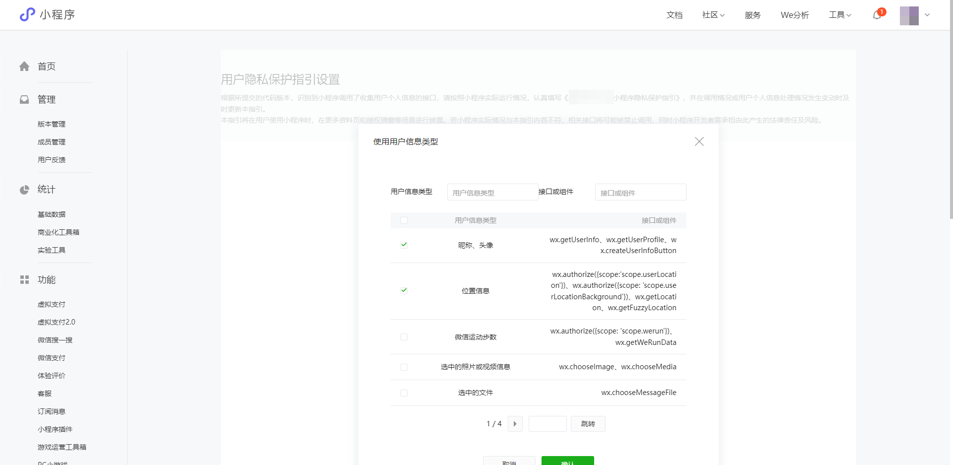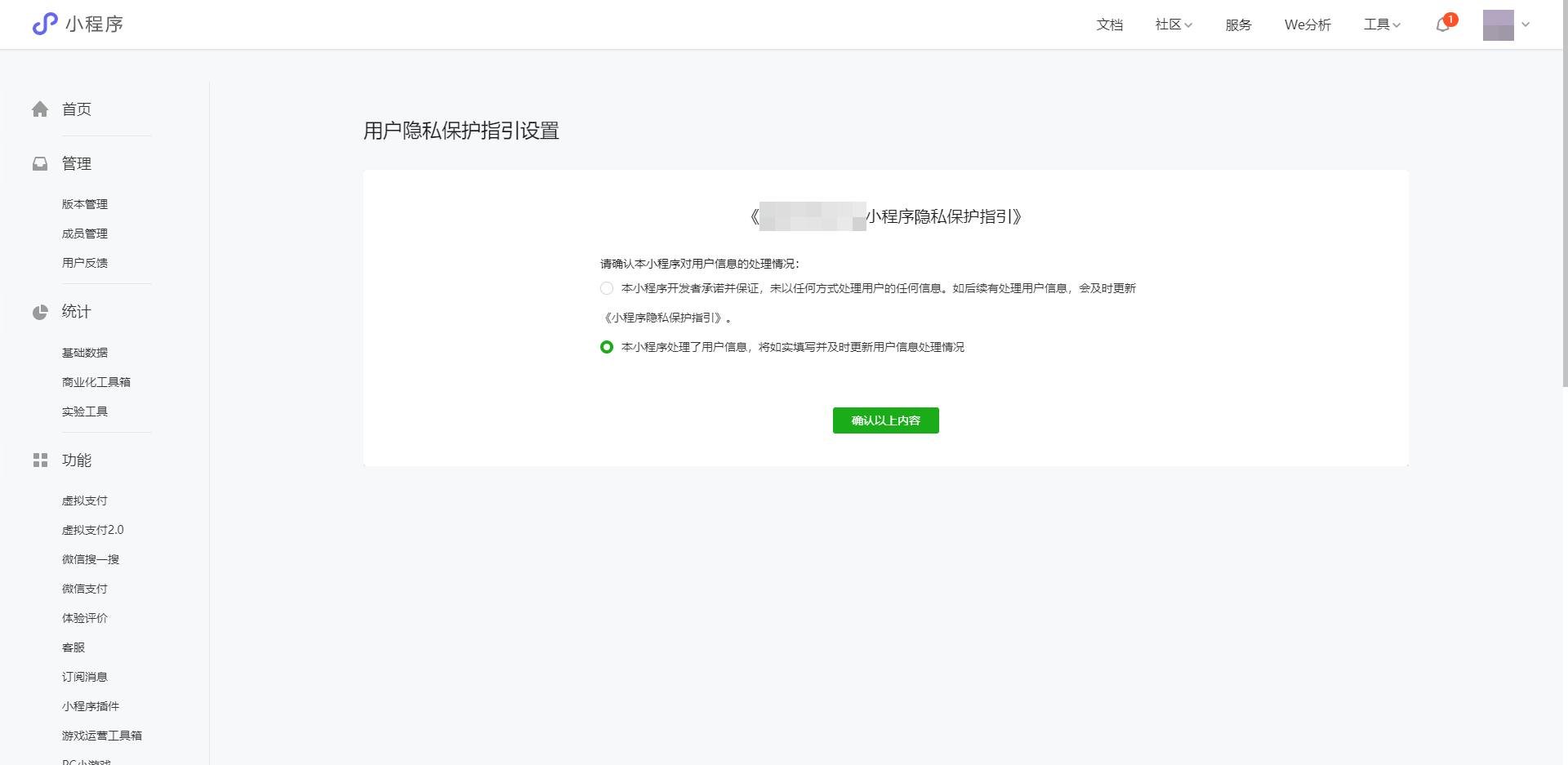确认涉及使用以上接口处理用户信息后,需在【MP后台-设置-服务内容声明-用户隐私保护指引】的【用户隐私保护指引设置】页面选择【本小程序处理了用户信息,将如实填写并及时更新用户信息处理情况】并确认。如暂未涉及处理用户个人信息,可签署承诺未处理,同时不可调用相关接口或组件。如后续有发生变更,则更新设置。