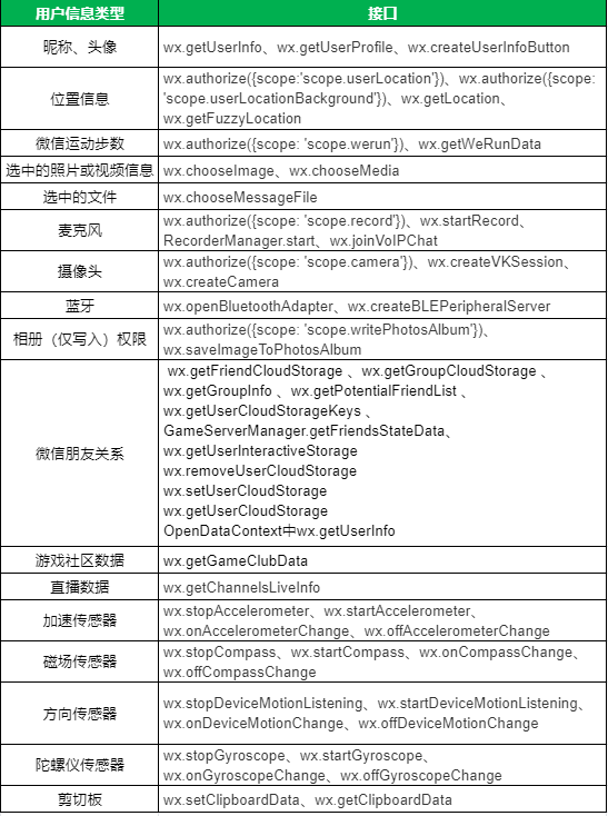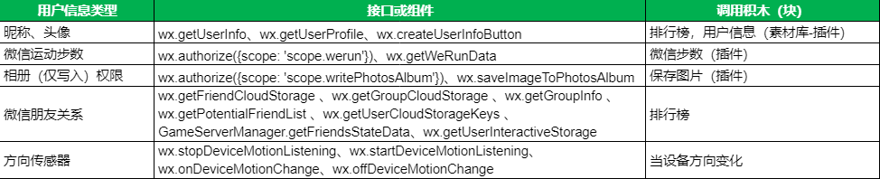 《用户隐私保护指引》信息类型中涉及的接口或组件调用方式详情,可通过微信官方小游戏开发文档《游戏引擎 /微信小游戏性能优化方案 /框架 /权限》查阅。