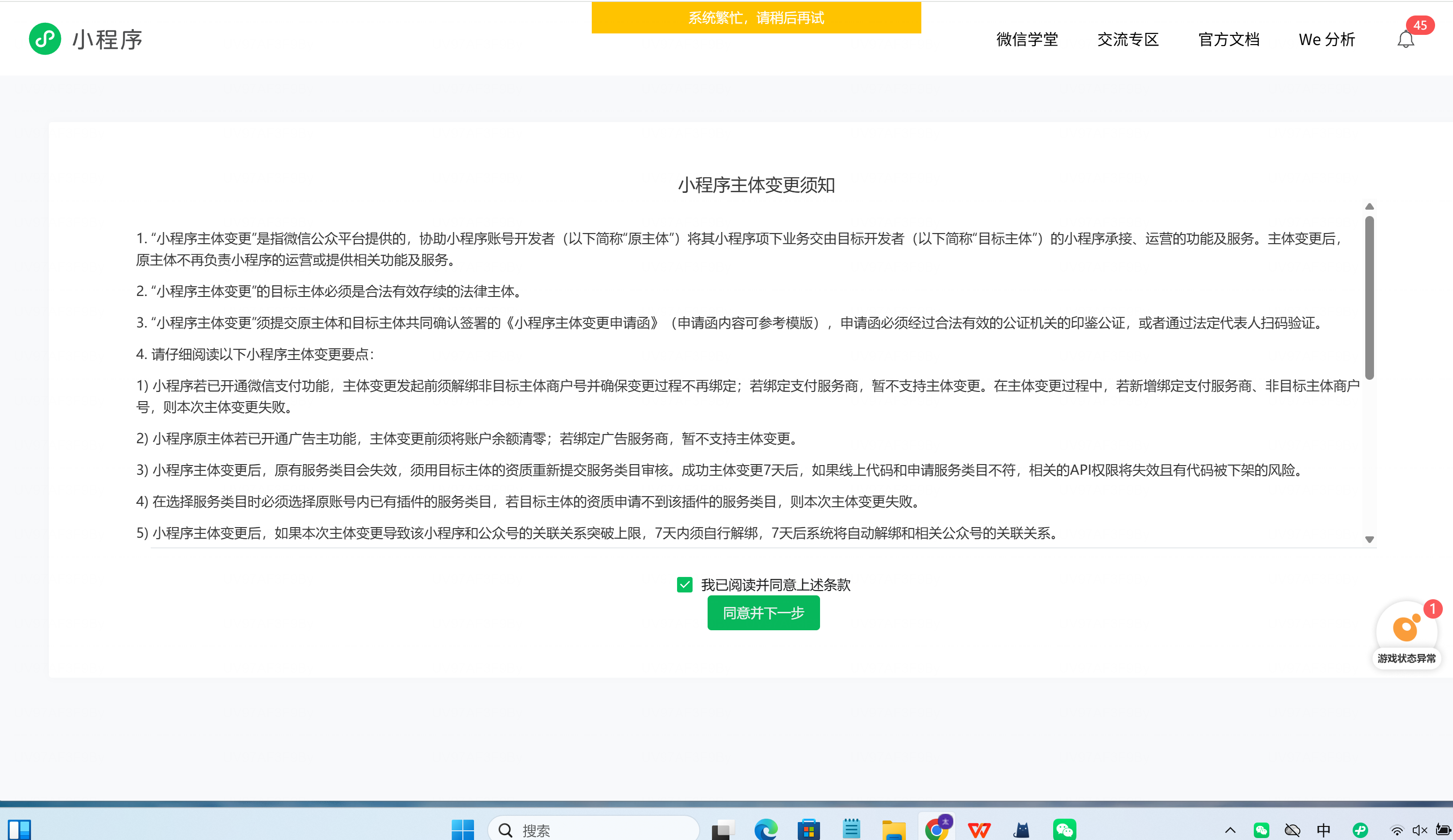 以前个体工商户下挂了一款小游戏A,后面注销了个体户营业执照新开了公司执照,发现现在不能转主体了,每次卡到下面界面,现在怎么办?