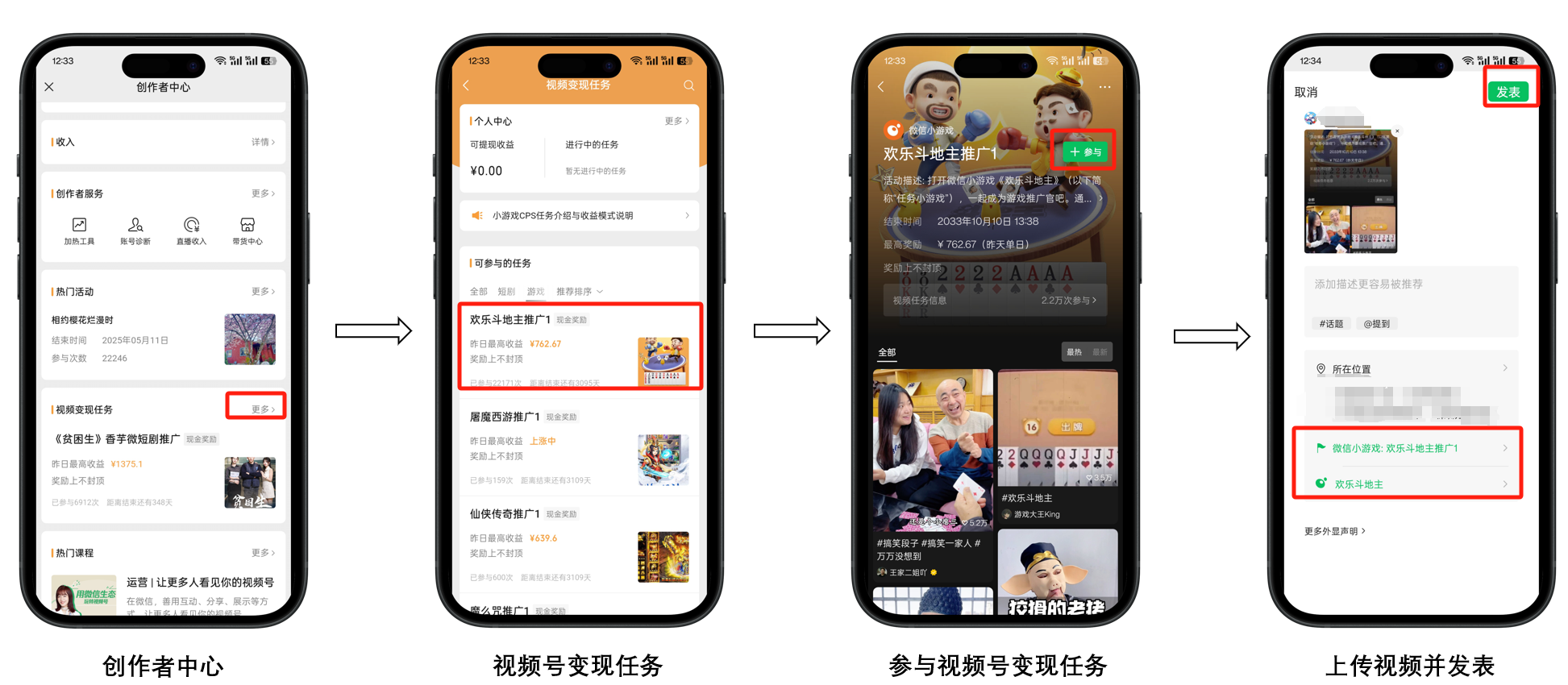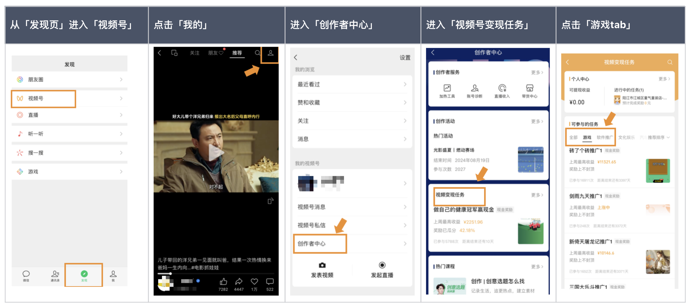 ② 参与路径:符合参与条件的创作者可以从「发现页」进入「视频号」,点击「我的」进入「创作者中心」,进入「视频变现任务」,点击「游戏」,就可以选择自己喜欢的游戏发表视频并获得现金收益