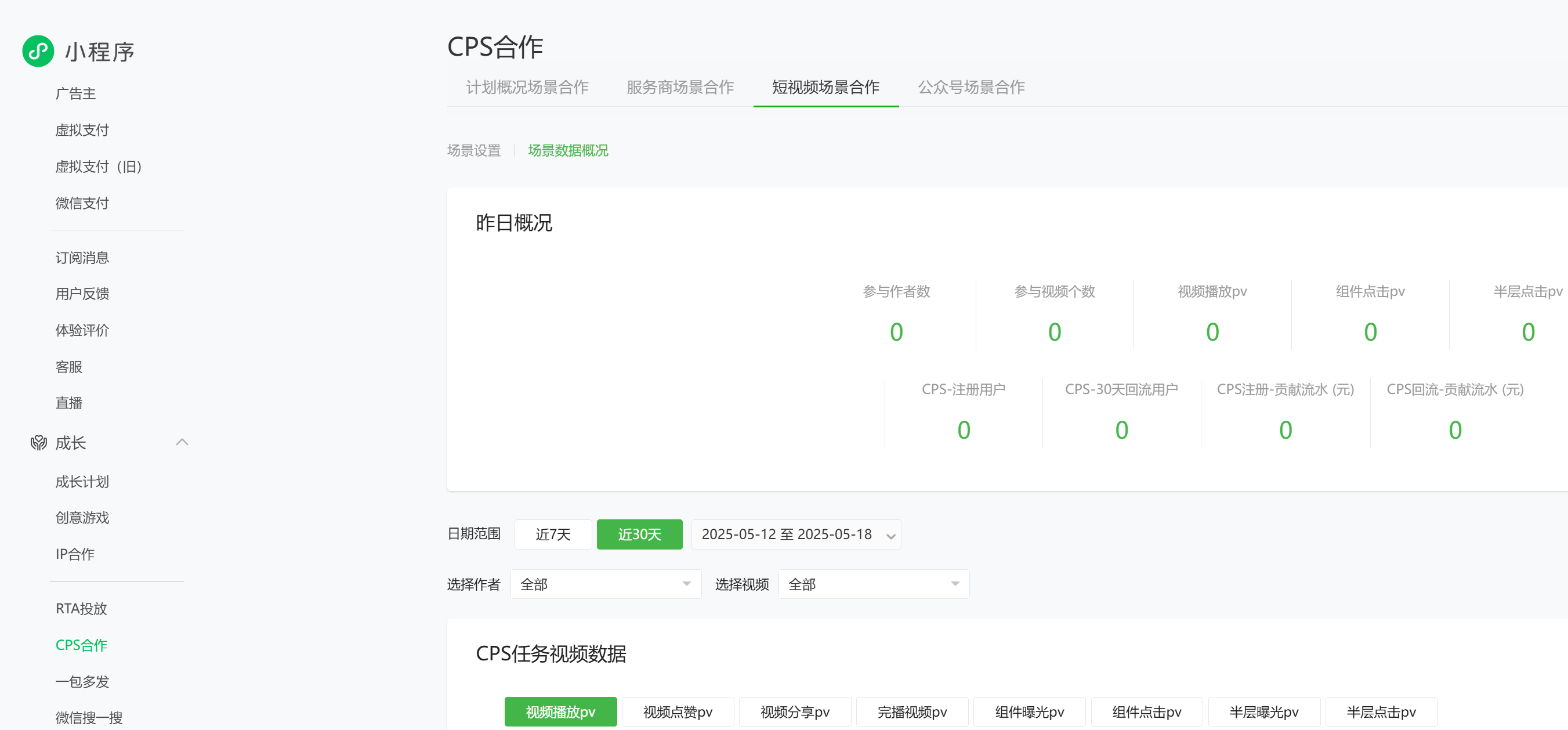 登录 mp.weixin.qq.com,CPS合作-短视频场景-场景数据概况