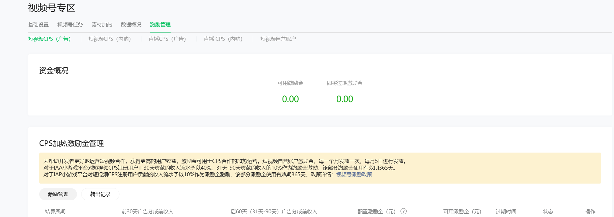 1、路径:MP后台-功能-游戏能力地图-视频号加热专区-激励管理-短视频CPS(广告/内购)