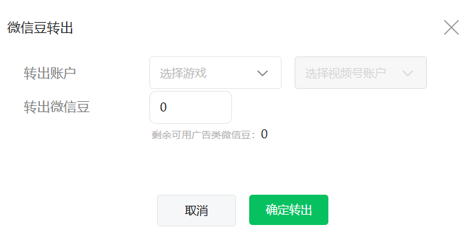 2、广告金提取:点击对应月份,在转出账户下拉框选择游戏和视频号,输入转出的微信豆后,确定转出 (注意:视频号需要绑定微信豆充值视频号账号才能转出,具体流程查看加热文档2.3部分)