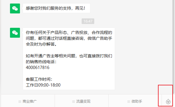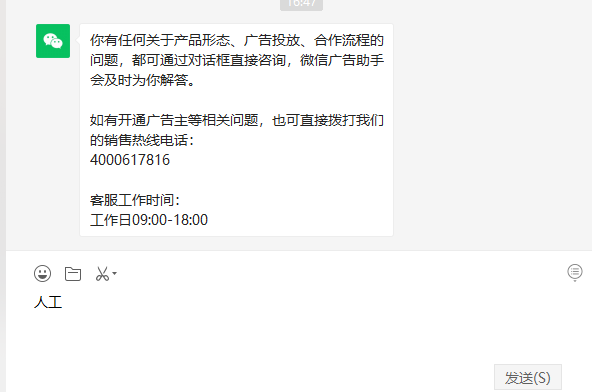 麻烦这边微信关注公众号‘微信广告助手“,对话框输入 人工 即可直接在线咨询广告相关的业务问题。