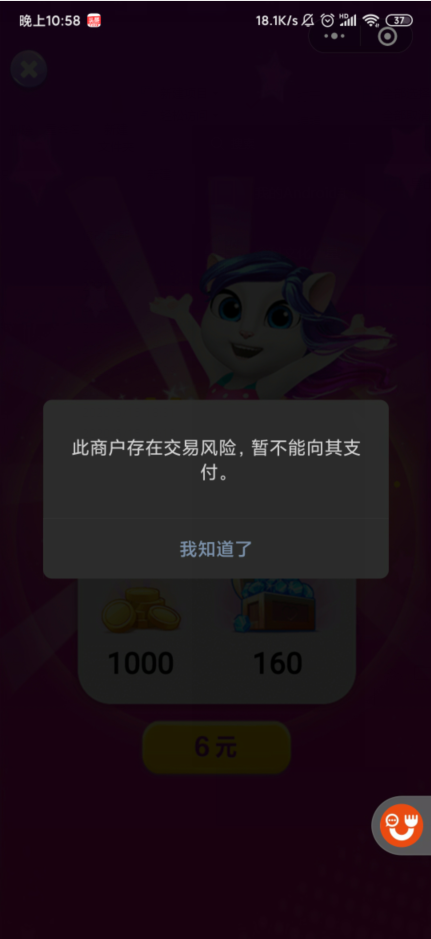 问题描述:在游戏内进行微信支付,提示此商户存在交易风险,暂时无法进行交易