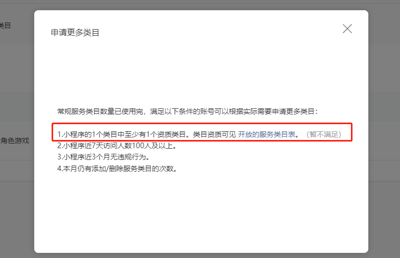 问题:4:申请更多类目的时候第一项显示不满足,该怎么操作才能满足对应的要求?