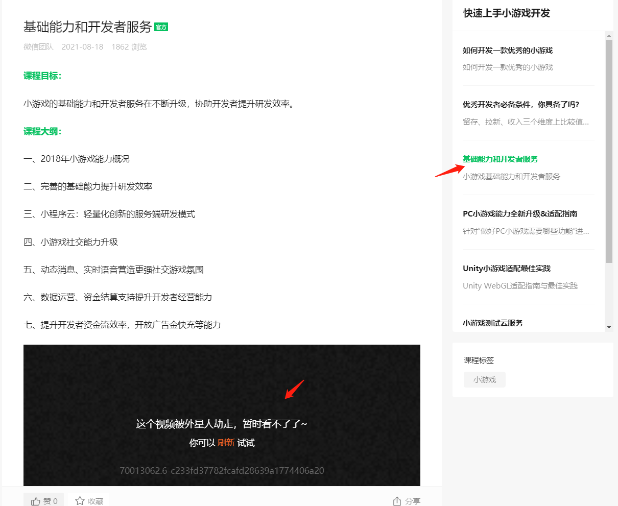 快速上手小游戏开发的官方教程,里面的“基础能力和开发者服务”教程,视频课程已无法打开。