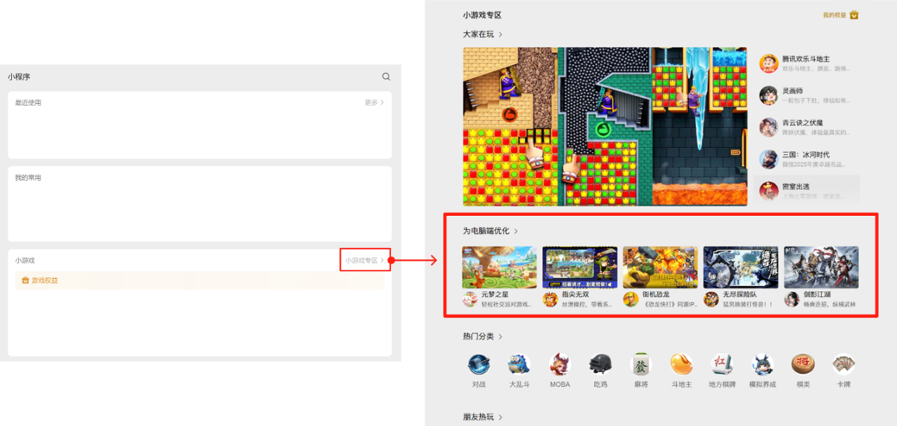 “为电脑端优化”是微信PC小游戏专区的特有推荐模块。对于针对PC端进行了专门适配,有更好体验的游戏,平台会将其收录至“为电脑端优化”分类,且推荐权重将受到游戏适配程度和在PC端表现的影响。进行了深度PC适配的优质小游戏,会更容易被PC用户发现,进而有利于游戏拉新促活。