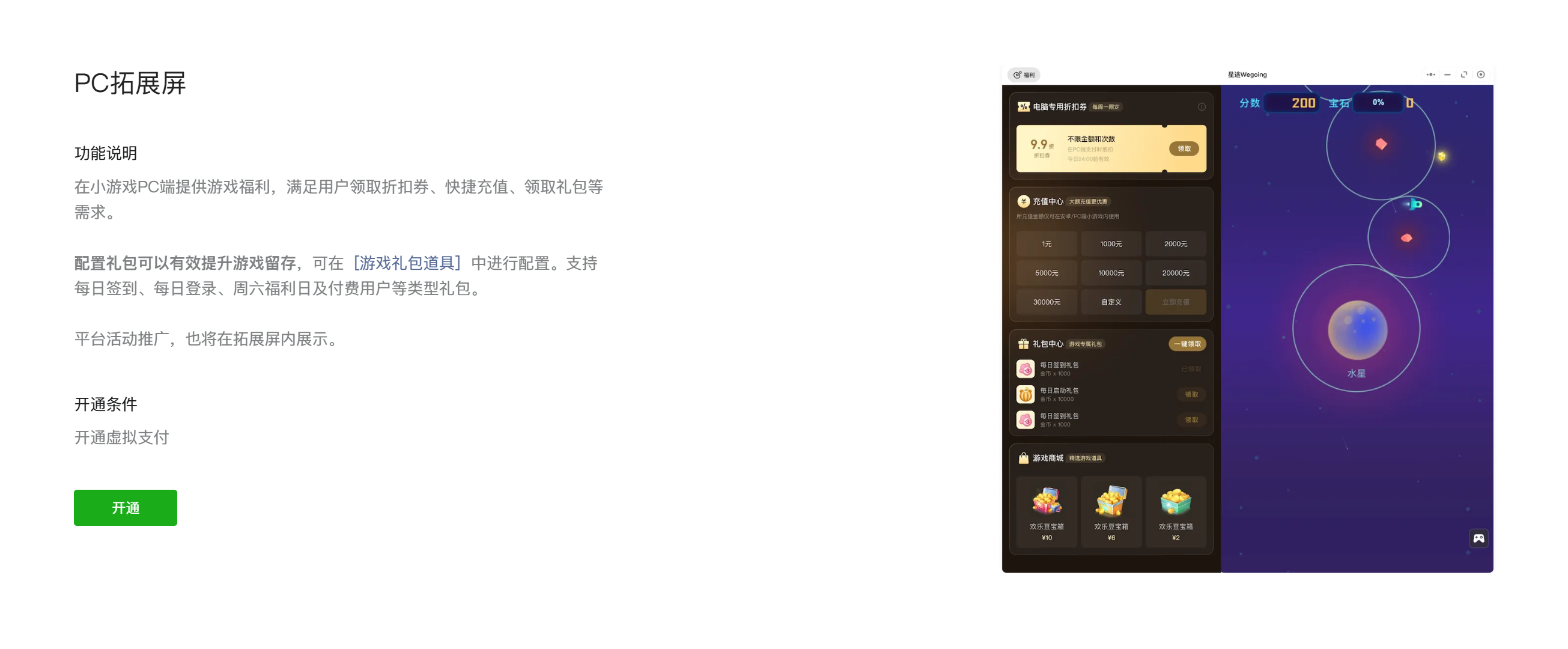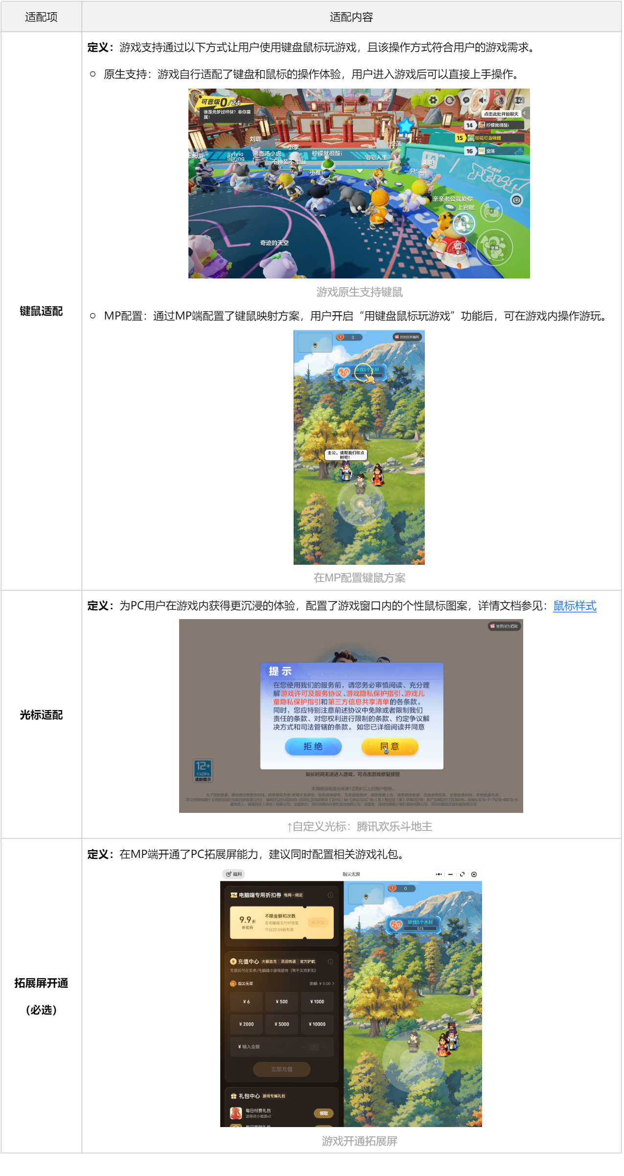 拓展屏是游戏在PC的重要运营场景,开通对于提升游戏表现有积极作用,也是进入“为电脑端优化”的必需条件。为避免部分游戏完成适配后,仍无法得到相关曝光推荐,平台建议完成了有效适配的游戏及时前往MP端开通PC拓展屏功能,并配置相关游戏礼包。