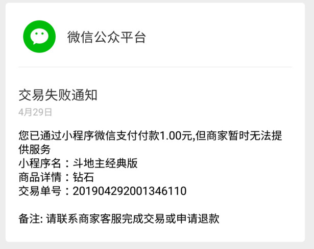 然后再几个小时后,支付发起账号的微信客户端收到服务通知,提示“商家暂时无法提供服务”,提示支付失败,如下图: