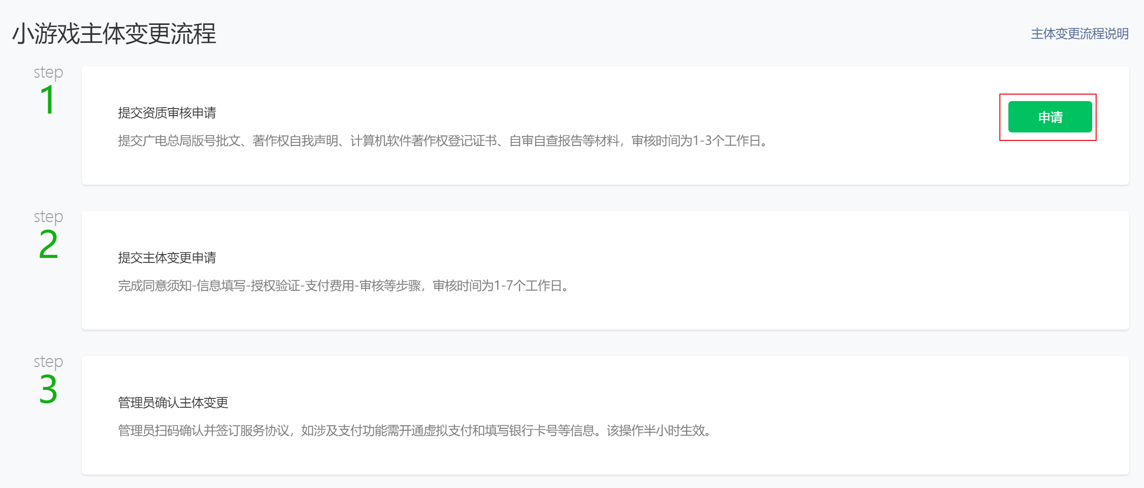 2.微信公众平台 -> 首页 -> 菜单栏左下角 -> 账号设置 -> 游戏设置 -> 资质管理 -> 前往管理(首次or后续更新资质材料)