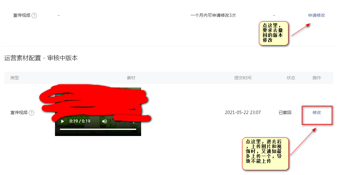 "运营素材配置"里面的"宣传视频"项,我先上传了一个宣传视频,然后提交了,过一会儿发现传错了,然后又撤回了,准备上传新的,然后通知我去 "撤回版本那里直接修改",然后我去"撤回版本"那修改,结果一直通知“只能上传一张图片‘’或“只能上传一个视频”,不能上传,里面也没有删除原视频的按钮,卡在这里了。