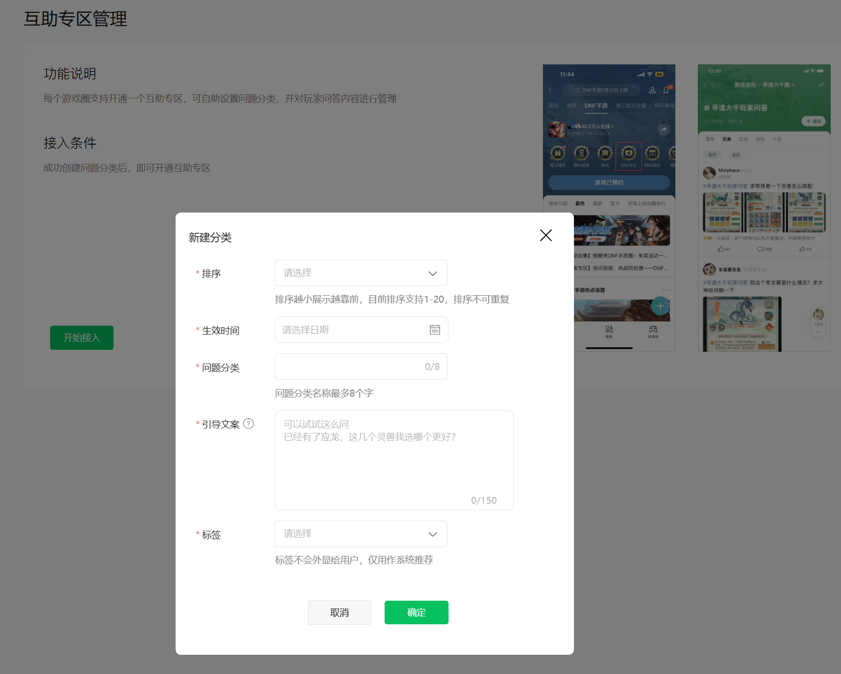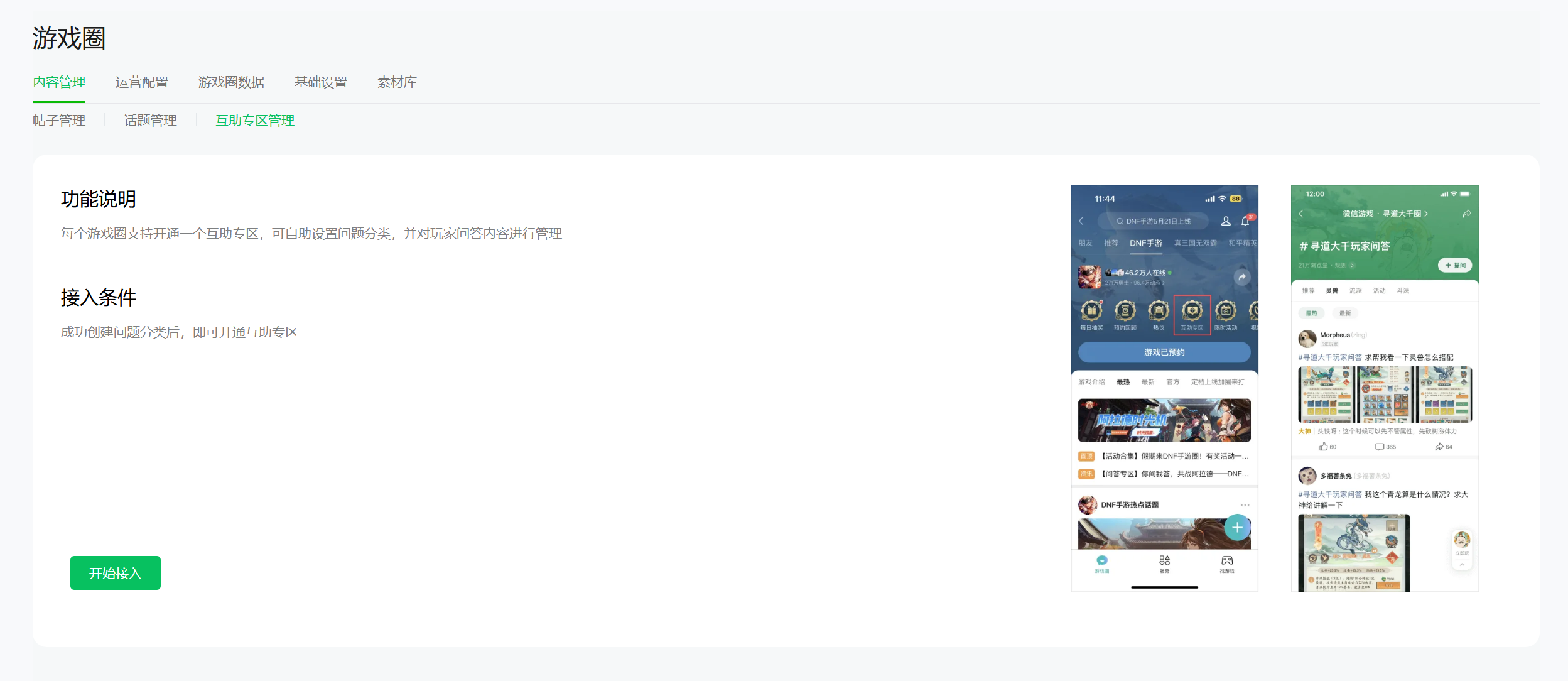 ● 进入「内容管理-互助专区管理」页面进行接入