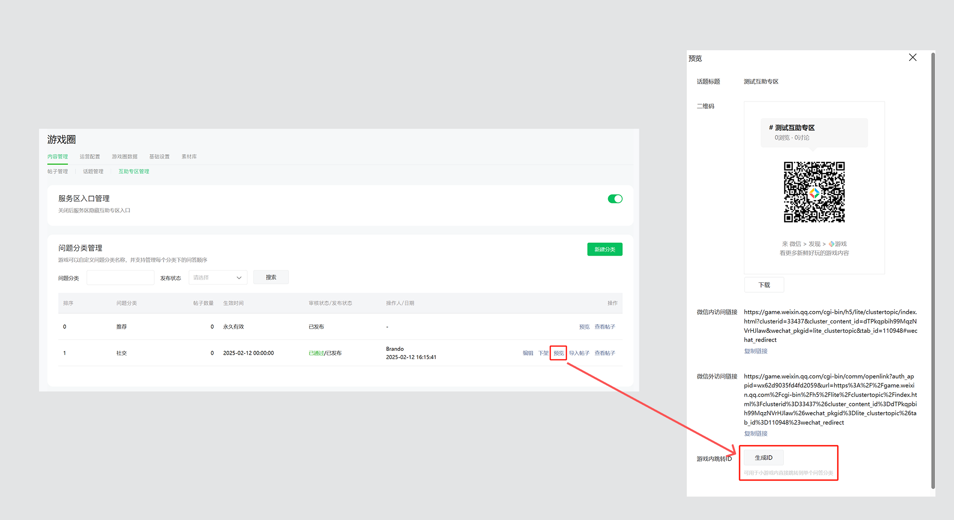 互助专区开通并启用后,在MP配置内容,点击预览「获取跳转ID」