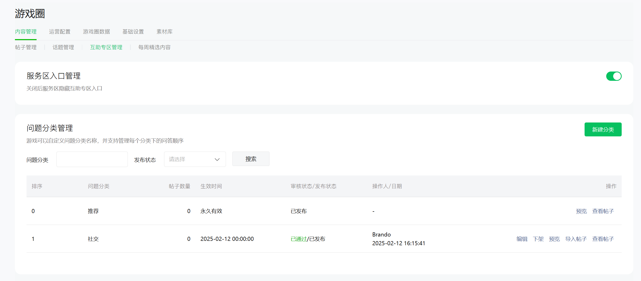 至少有一个问题分类处于已发布状态后(推荐分类不计算在内),即可在服务区入口进行管理,