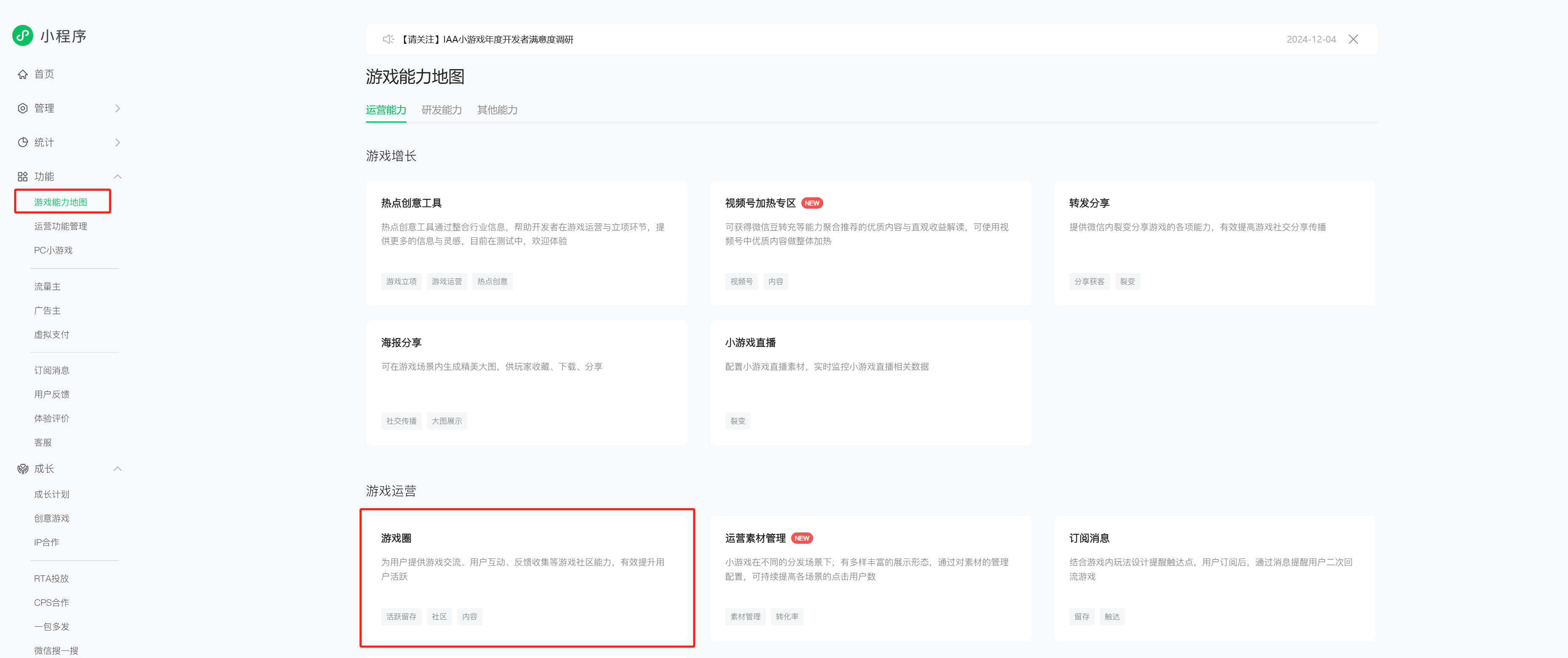 ● 登录MP,前往「MP后台-游戏能力地图-游戏圈」开通