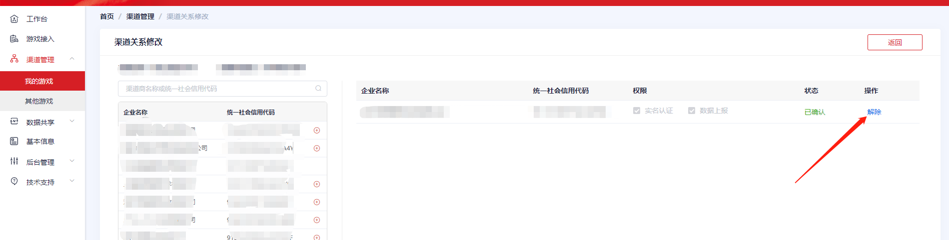 登录中宣部实名认证系统“首页”=>"渠道管理"=>“我的游戏”=>选择游戏对应的“渠道管理”=>选择我司企业的“解除”