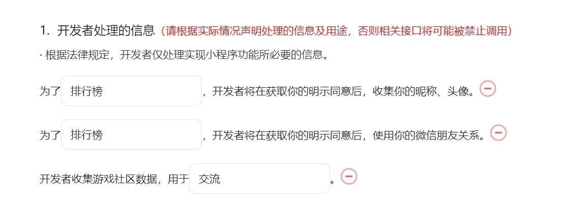 以上两类方式处理的用户个人信息均需要在《用户隐私保护指引》中进行合规披露。即使用对应的小游戏账号登录mp.weixin.qq.com(后文简称mp后台),在“设置-基本设置-用户隐私保护指引”中完成用户隐私保护指引填写。更多详情可见小游戏《用户隐私保护指引》合规披露指南 | 微信开放社区
