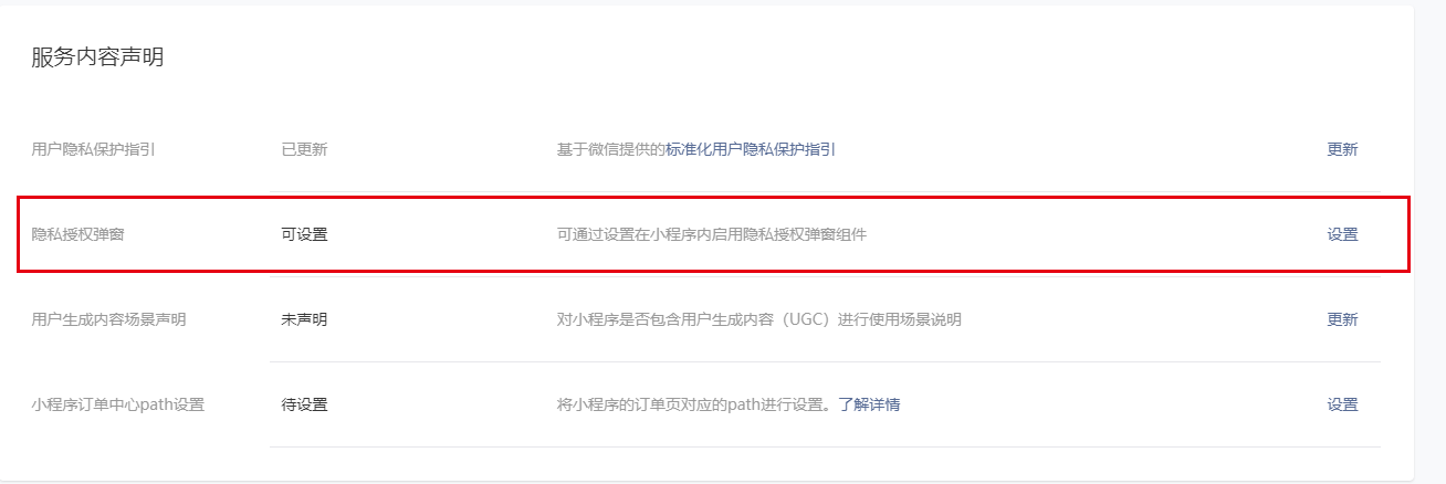 - 如果有处理用户个人信息,则需前往「MP设置-服务内容声明-用户隐私保护指引-更新」配置隐私政策,并按流程完成步骤三和步骤四。