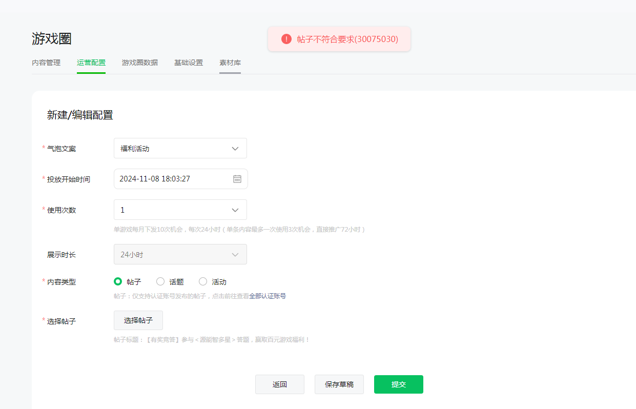 配置小游戏-游戏圈首页气泡,为什么提示帖子不符合要求?之前都可以,而且也是认证账号发布的帖子哦!