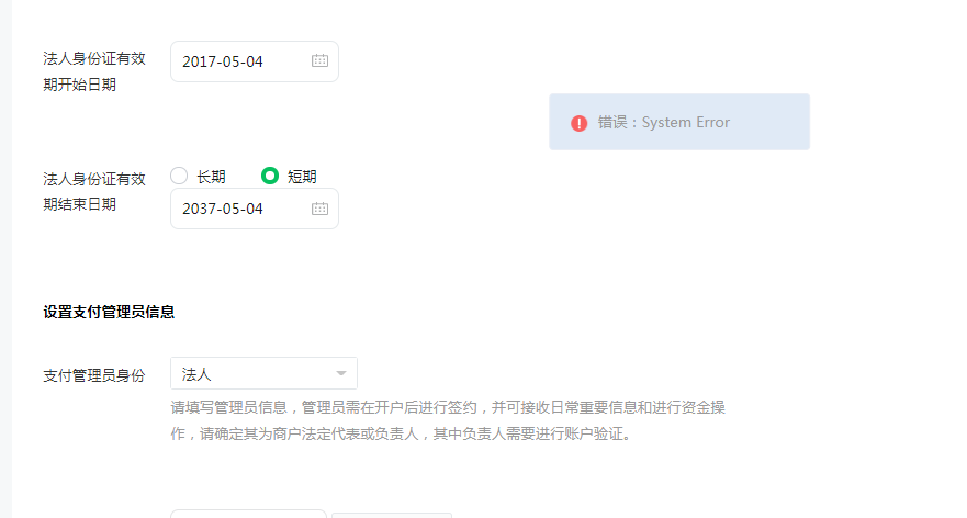 虚拟支付2.0开通条件都已完成,目前再签约2.0 提交账户跟管理员信息的时候 提交页面一直出现图中的报错,麻烦帮忙紧急查看下,之前均未出现该问题,看社区也有其他类似的情况出现,在线等官方答复