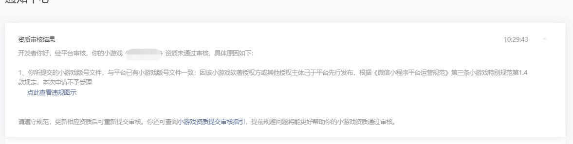 申请名字被打回。提示与平台已有小游戏资质版号文件一致