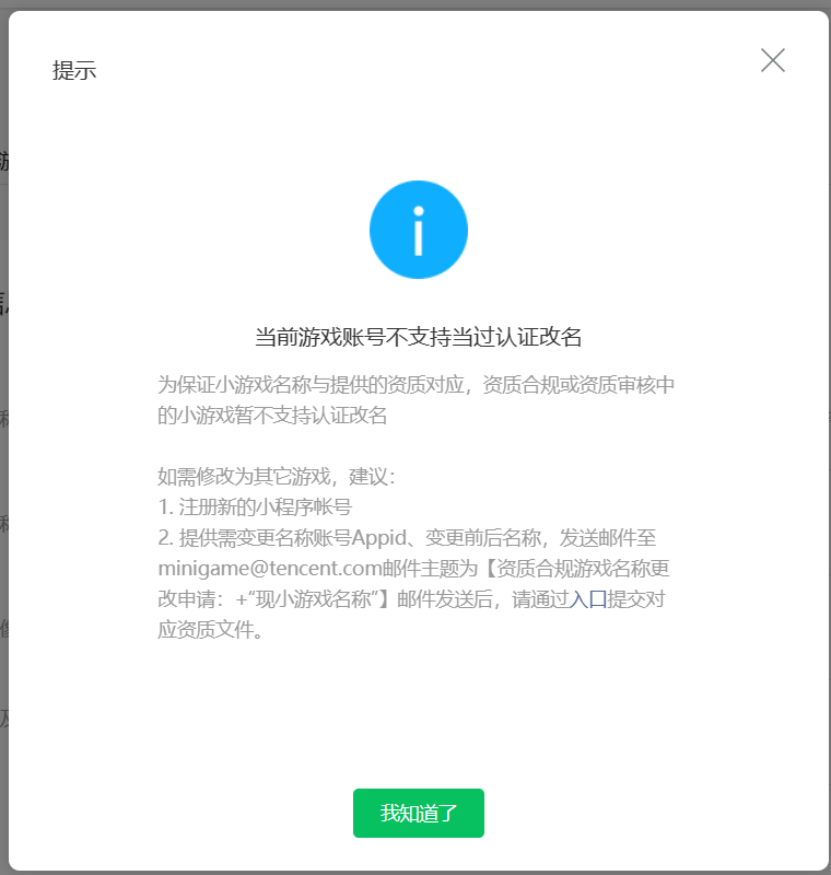 社区管理员,您好,提审了一个小游戏,审核结果是游戏的名字不合规。现在我想修改游戏名字,但是却无法进行修改,提示“当前游戏账号不支持当过认证改名”,我已删除了正在审核的游戏版本,计划提交一个新版本,并且整改名字后再提审。