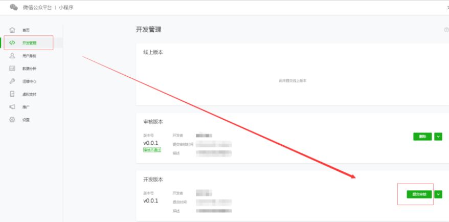 6. 登录微信公众平台(mp.weixin.qq.com),进入公众平台点击左侧的“开发管理”->再找到所需提交的版本 -> “提交审核”
