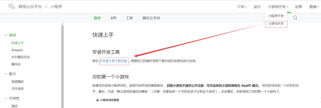1. 开发者工具下载:登录微信公众平台(mp.weixin.qq.com)首页 -> 点击“文档”-> 点击“开发”中的“小游戏开发”-> 前往开发者工具下载界面下载开发者工具。