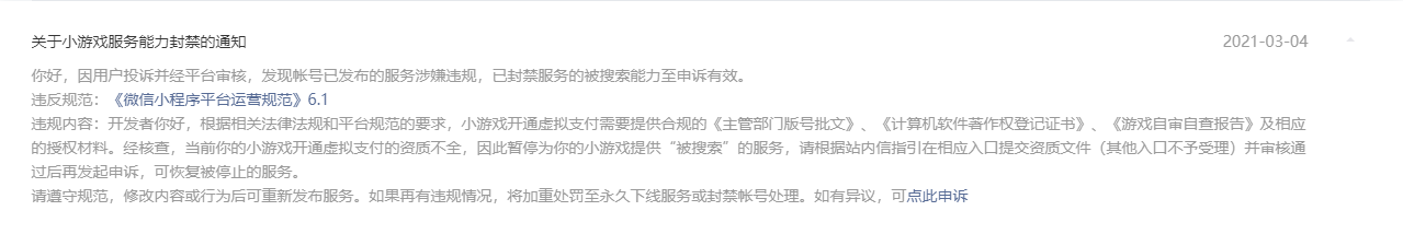 请问下,我小游戏因为版权问题已修改名字,并且游戏内已关闭了内购功能,但是后台一直提示版号不对应名字,请问下官方能帮忙关闭内购功能,并且取消我的惩罚吗?
