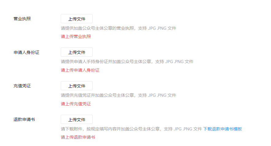 请将退款资料加盖公章后重新提交,若个体工商户无公章证明,可由法人代表签字按手印代替,并提供法人身份证正反面复印件/扫描件,谢谢。