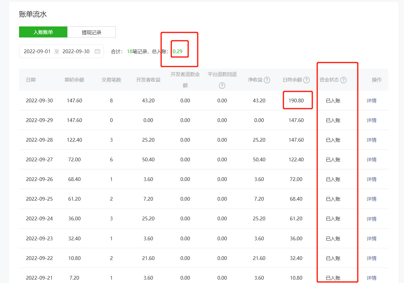 问题一:9月的入账总额和明细在后台是对不上的,您看都入账了。为什么上面的总入账只有0.29元,如下图