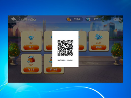 PC小游戏支持通过手机扫码进行虚拟支付,完成游戏道具购买。