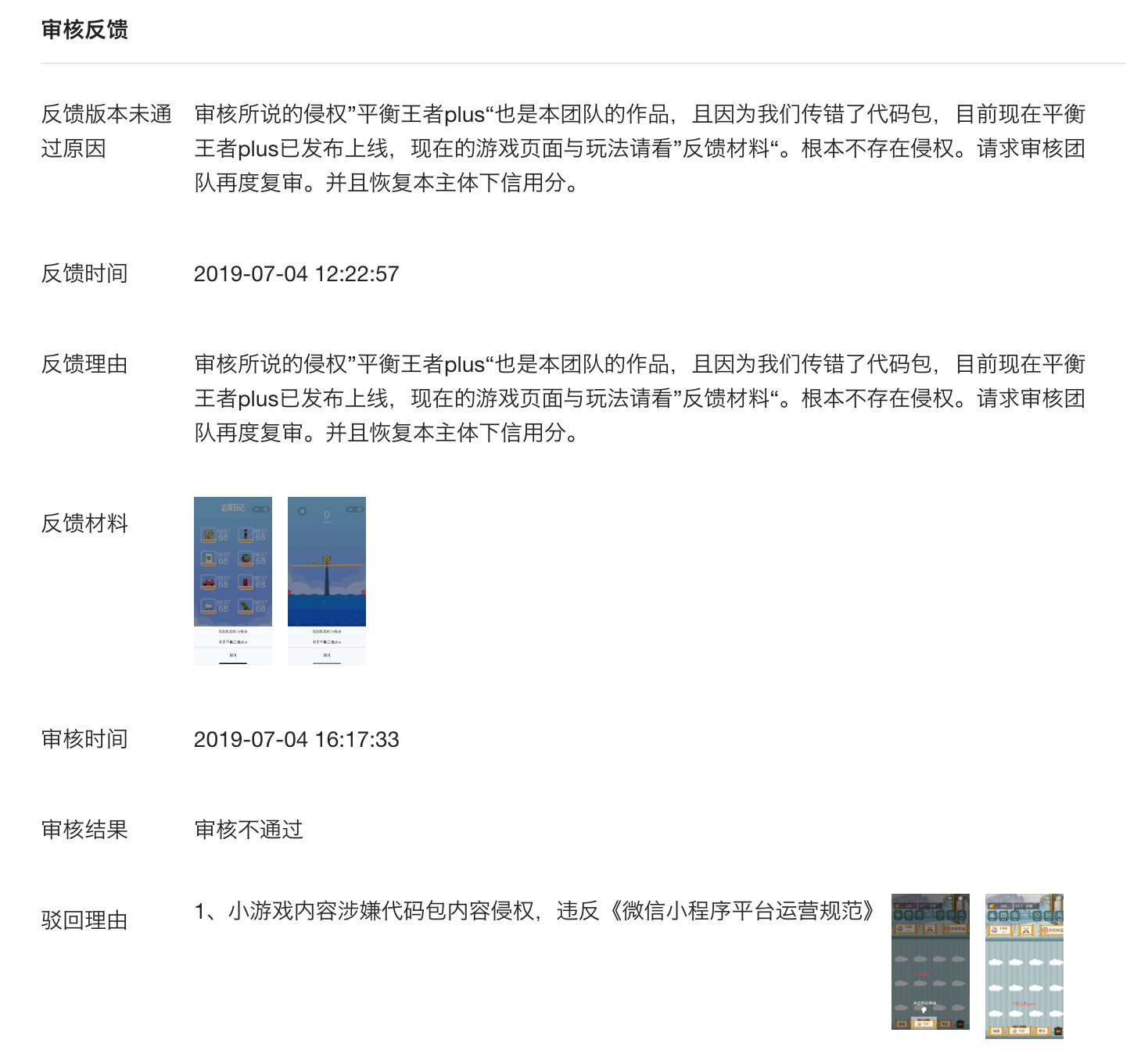 因为一个主体下只能有5个小游戏。所以我后来把唯我独仙这个小游戏放到了B主体下发布审核,审核团队一直说我是侵权了平衡王者的代码包,并且给了曾经在a主体下“唯我独仙”体验版的截图。可是这是曾经体验版的截图,并非上线的平衡王者。
