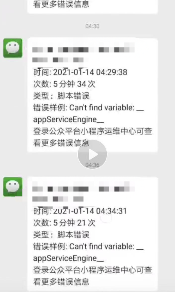 每天给我发一堆这个一模一样的报警 Can't find variable: __appServiceEngine__ 这个问题官方不是在10月份公告里说修复了么? 真不知道修复了啥,唉 每天报警弄得我大半夜起来看,官方什么时候能好好修一下