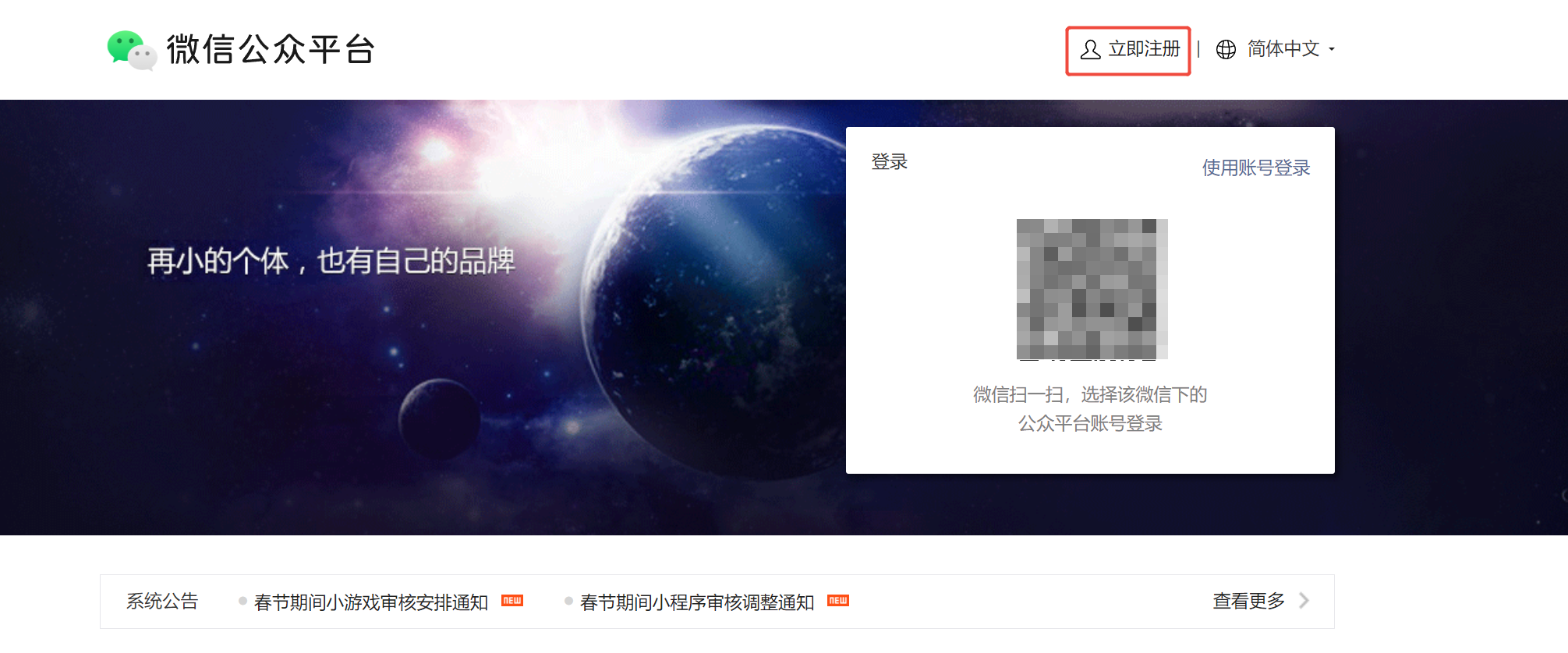1、访问官网 https://mp.weixin.qq.com/,点击“立即注册“进入到注册页面。