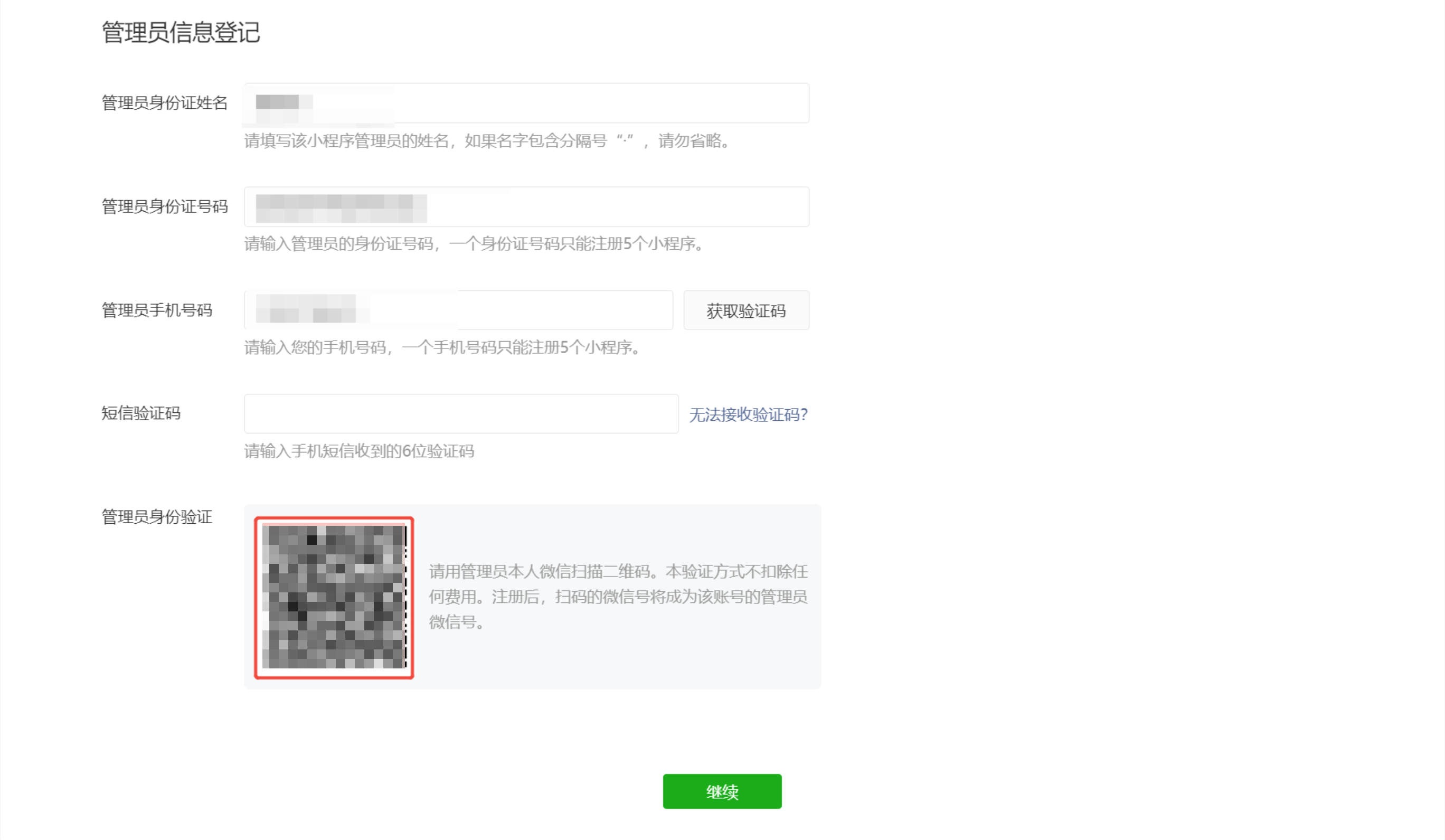 ● 填写管理员信息,并使用本人微信进行扫码验证,点“继续“进行提交