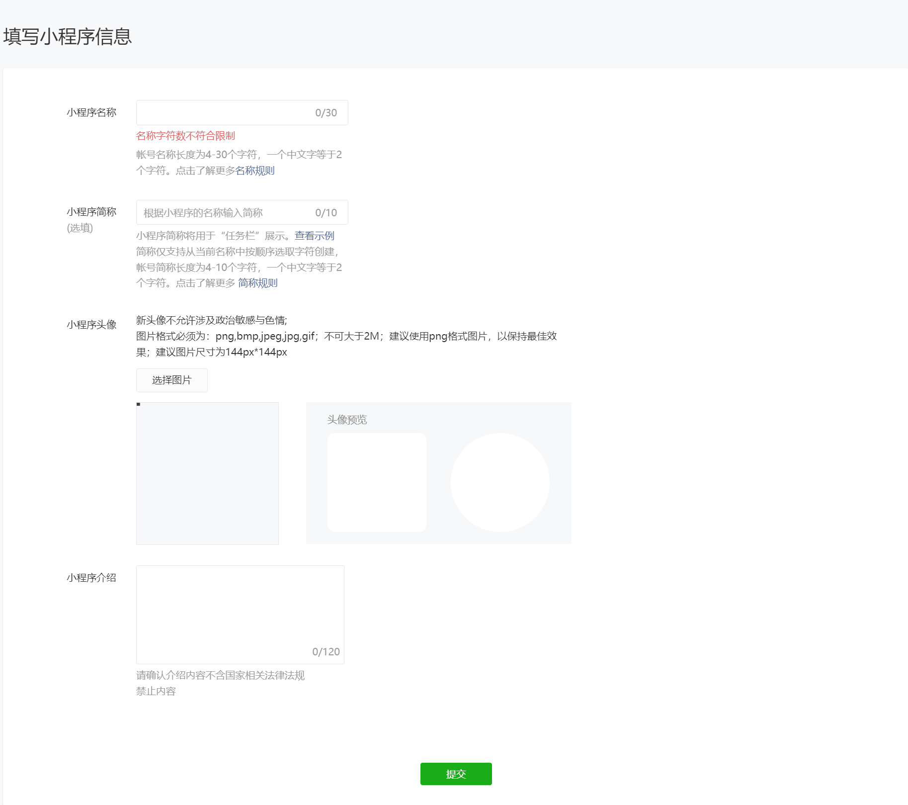 ● 进行小程序信息填写,完善小程序名称、头像、简介。