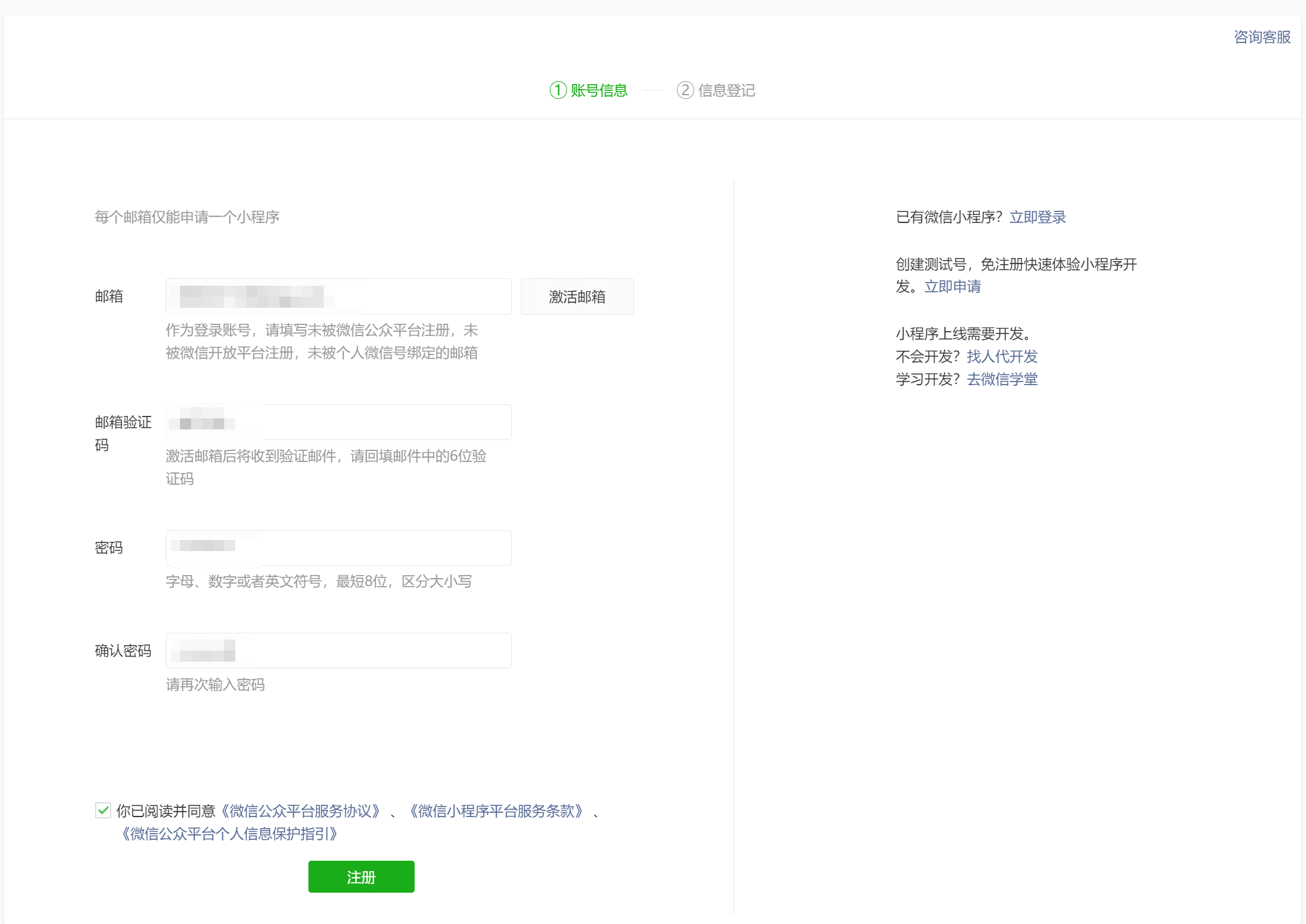 1、 1个没被注册过的邮箱,每个邮箱仅能申请一个小程序