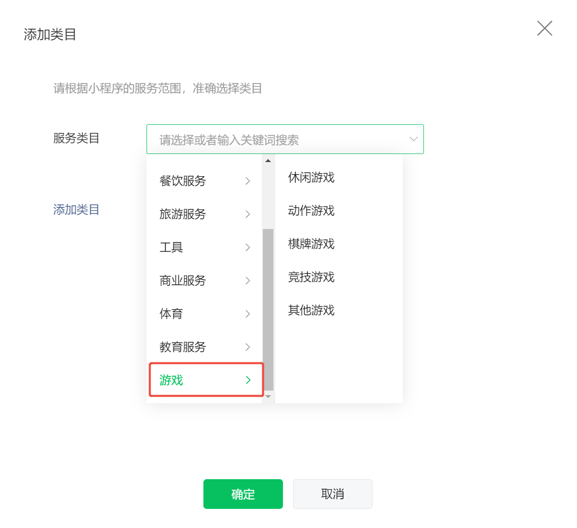 ● 补充小程序类目,一级类目需选择游戏。小游戏账号只有”游戏“这个类目,无法更换或删除,请勿选择错误,否则只能重新注册。
