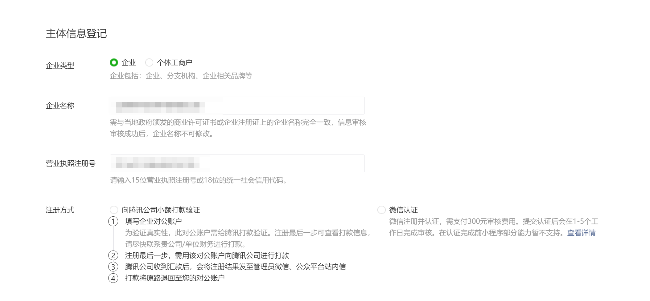 ● 选择企业之后,填写企业名称、营业执照注册号,选择注册方式(具体情况可查阅文档)