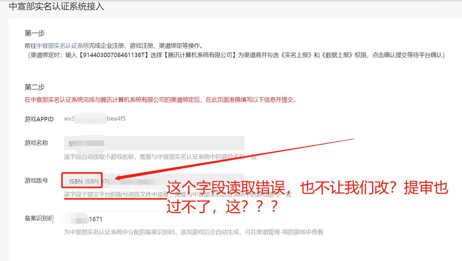 游戏版号:需要与中宣部实名认证系统中的游戏版号一致,为 ISBN 开头的版号